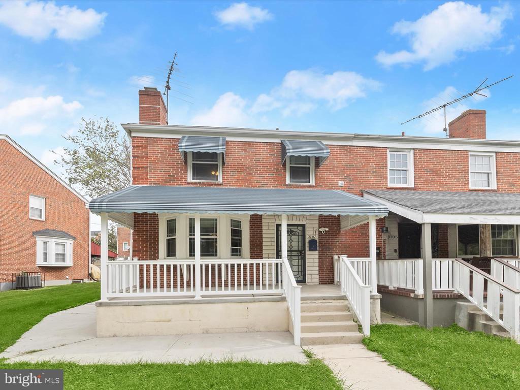 Brick exterior semi-detached home offering exceptional indoor and outdoor living. A two-car carport and a beautifully landscaped garden with a patio and water feature create a private retreat with seamless access to the screened-in patio. Enter from the front porch into the open living and dining room combination, showcasing luxury vinyl flooring, a bay window, and a cozy wood-burning fireplace. The spacious kitchen is a chef’s dream, featuring a massive center island with bar seating, tall cabinetry, a double sink, an industrial stove, granite counters, stainless steel appliances, and ample storage. Upstairs, two generously sized bedrooms with hardwood floors are complemented by a convenient second-level laundry room and a luxurious bath with a double vanity, elegant tilework, and a walk-in shower. The finished lower level expands your living options with a recreation room, bedroom/office, full bath, and direct exterior access. A main-level powder room adds everyday ease. All of this is in a prime location just moments from I-95, I-695, and I-83, ensuring effortless commutes and connectivity.