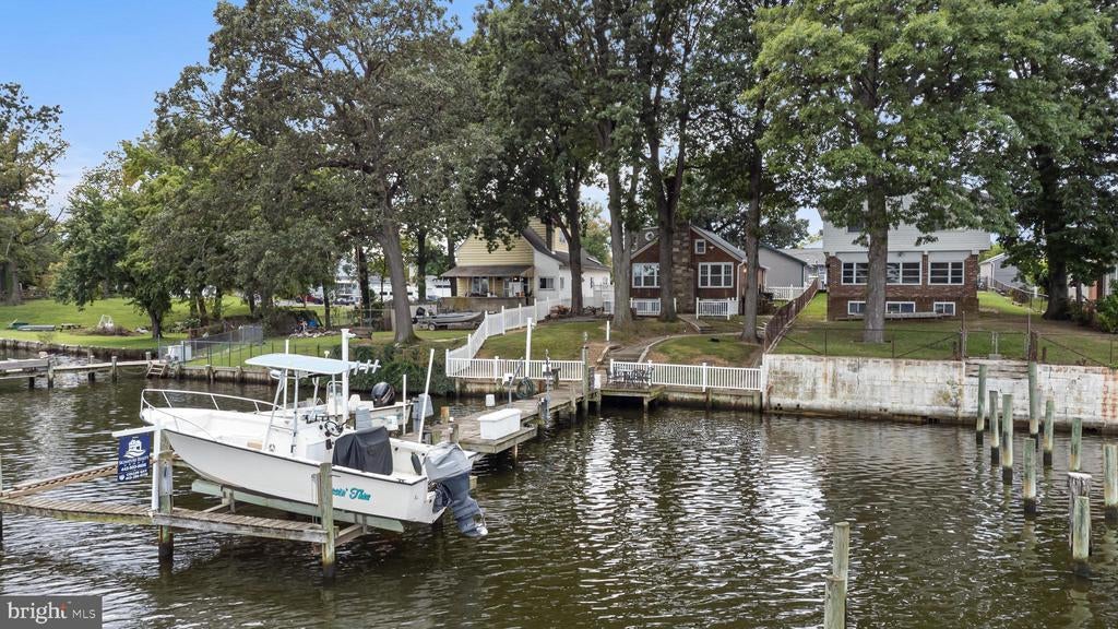 Welcome to your Waterfront Oasis! This well-appointed 4 bedroom, 2 bath, move-in ready Cape Cod offers all of the amenities of a luxury waterfront at an affordable price with NO FLOOD INSURANCE. Your fully-fenced yard boasts extensive hardscaping featuring an elevated patio with unobstructed views of Bear Creek, outdoor fire pit, and stone walkway leading to a 70' pier equipped with two boat lifts, two jet ski davits, a fish cleaning station, water/electric, and an average water depth of 7' at the lifts ensuring full access no matter the tide. Interior highlights include an oversized L-shaped kitchen with 42" wood cabinetry and timeless granite countertops, formal dining area with chandelier lighting, living room with gas fireplace and direct water views through newer double-hung windows, walk-in closet in primary bedroom, full length upper-level dormer with dedicated mini-splits in each bedroom, fully-finished basement with an additional family room to entertain, wood burning fireplace, home office/game room, and a second kitchen... all under a brand new roof! To top it all off, your oversized 2 car garage is conditioned via mini-split, has a gas cooktop, sink, and ample storage room. Schedule your private showing today to see what makes this stunning waterfront house a Home!