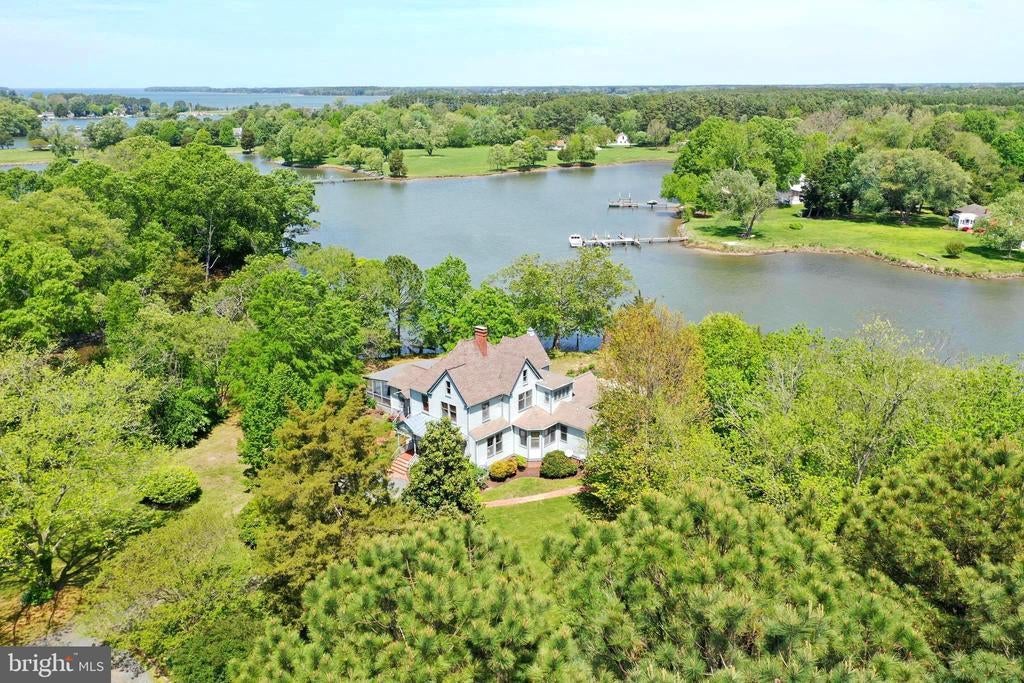 This house is a showstopper! A work of art that feels part castle, part cathedral! Pictures don't do it justice! It's a unique, historic, waterfront estate that combines privacy & nature & excellent location on Oak Creek between St. Michaels & Easton. The treelined drive welcomes you to this one of a kind home built in 1890 and situated on 11.59 acres. Featuring stained glass transoms, the original staircase, heart pine wood floors, 10 foot ceilings, oversize windows, custom triangular door frames, 3 beautiful & unique fireplaces, main level primary suite with living room & private entrance & sliding doors to the huge wrap around 38x40 screened in porch with beamed wood ceiling. The custom designed kitchen with pine craftsman cabinetry & breathtaking dining room with 16 ft cathedral ceiling look out over the garden lined pool, waterfront & artfully refurbished dock with 3.5 ft water depth. The living room has the original French doors, carved fireplace mantel & stained glass transom. Unique, historic, triangular side-by-side fireplaces in the family room . Charming sunroom with lots of light off the family room. Upstairs is a second primary bedroom that includes attached luxury, spa bath in wood & marble & 6 closets! The second floor also has a waterview guest bedroom, original curved hallway, full bath & fabulous bright office studio with amazing views over the pool & water. The third floor suite includes a bedroom, full bath, studio living room, cedar walkin closet & impressive gothic window & skylight. Basement/crawlspace is fully encapsulated. Detached garage for gardening, tools & workshop. PLUS the property includes a beautiful private art/music/camping cabin in the woods! Designed by the owners for their passion for art & music. The interior of the cabin is unfinished with electric only but full of potential! Check with Talbot County for more information on hunting, farming, additional accessory dwelling units & short term rentals. Excellent location near T's General Restaurant, Oak Creek Sales, Post Office & the historic Oaks Inn!