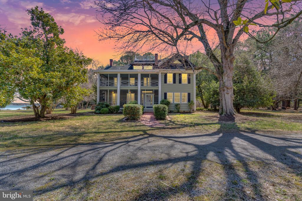 For the first time in over half a century, an extraordinary opportunity presents itself—a chance to claim a piece of history that has remained in the loving stewardship of one family for generations. Nestled on over 13 private acres, this breathtaking 6-bedroom, 4.5-bath waterfront estate offers an unparalleled living experience with 4,352 square feet of main living space plus an additional 1,500 square feet on the 3rd level. The property boasts more than 960 feet of pristine, unobstructed waterfront on Broad Creek—a front-row seat to nature's daily spectacle, from migrating waterfowl to graceful swans gliding across tranquil waters. A custom waterfront deck, private pier with boat lift, and meticulously preserved natural surroundings create a perfect harmony between water and land. Approach along a private tree-lined drive that builds anticipation before revealing the estate in its full splendor. The level, meticulously landscaped grounds provide a serene backdrop for the stately historic residence that has witnessed decades of family memories. Enter through the spacious screened-in porch into a grand foyer that welcomes you to an expansive living and entertainment room. This inviting space features walls of windows, abundant natural light, and a grand fireplace with decorative mantel. To the left of the entryway, find a versatile room suitable as additional living space or a home office, complete with built-in shelving and water views. The formal dining room, with its second large fireplace and waterfront vistas, has hosted holiday feasts and special occasions for fifty years. The dining area flows seamlessly into the updated eat-in kitchen featuring granite countertops, a large breakfast bar, gas cooktop, stainless steel appliances, and spacious pantry. A waterside deck awaits new gatherings, while a butler's pantry provides additional storage. A main-level half bath completes this floor. The grand staircase (or secondary staircase between study and dining room) leads to six generously sized second-floor bedrooms. The owner's suite—positioned for privacy at the hall's end—features a fireplace, ensuite bath, and access to a private front-side balcony spanning the home's length. Front-side secondary bedrooms share balcony access, while back-side bedrooms are served by a well-appointed full bath. The third level offers an additional 1,500+ square feet with a large bedroom area, spacious entertainment room, and three smaller rooms ready for customization. This level comes with completed drywall and electrical work throughout, plus a fourth full bathroom featuring a custom tiled shower. A rooftop terrace provides panoramic views of the estate and tranquil waters. The property includes a large detached garage with ample parking and storage. An externally-accessed basement level offers perfect storage for family treasures. A wide pad outside the garage accommodates boat, RV, or equipment storage. While thoughtfully modernized, this home retains its historic charm—exquisite hardwood floors, soaring ceilings, intricate architectural details, elegant trim, original windows, and beautiful woodwork throughout tell the story of craftsmanship cherished through decades. This beloved family estate, a repository of fifty years of memories and celebrations, now stands ready to begin its next chapter. Opportunities to acquire such a storied waterfront retreat—combining history, natural beauty, and modern comfort—arise perhaps once in a lifetime. Your chance to create the next fifty years of memories begins here.