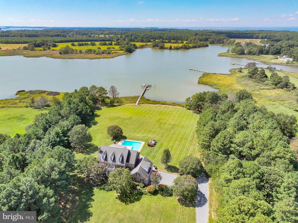 Just 4.9-miles outside historic St. Michaels, MD...Classic "Eastern Shore Waterfront Retreat," featuring a substantial 5,400+ sq. ft. home, thoughtfully designed to capture cooling SW summer breezes and spectacular sunset views across the sparkling waters of Harris Creek. Sited on 8.26 private acres w/over 300' of natural "living Shoreline," features of the brick home include high ceilings (including a cathedral ceiling in the family room and tray ceiling in the primary bedroom); four (or 5) bedrooms; 4 full and 2 half baths; large primary suite w/recently updated bath; gourmet kitchen w/island and breakfast room connected to a wonderful family room w/fireplace. Generous waterside glass to maximize the water views from most rooms. Beautiful waterside swimming pool (heated), surrounded by a very spacious multi-level patio. For Chesapeake bay boating, there is a substantial 6' wide x 200' dock w/electric boat lift. Water depth at the dock on a typical low tide (MLW) is nearly 5 ft. Typical high tide depth, approx. 6.5 ft. This is a great boating, fishing and crabbing location. Tilghman Island waterside restaurants and marinas and the open waters of Chesapeake Bay are just a short, scenic boat ride downstream from the dock. By car, the Town of St. Michaels with its many fine restaurants and attractions is less than 10-minutes away. The house is well-elevated and is NOT in a high risk flood zone (flood insurance not mandatory) and No HOA!