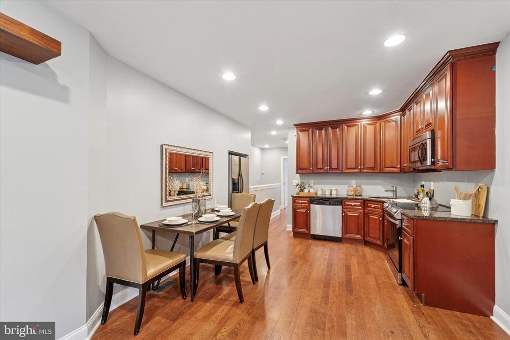 The main floor welcomes you with a charming foyer that flows into a sunlit dining area and kitchen. Gleaming hardwood floors run throughout, reflecting the natural light that pours in through the two oversized front windows. The open-concept kitchen is both functional and stylish, featuring stainless steel appliances, rich wood cabinetry, and ample prep space.